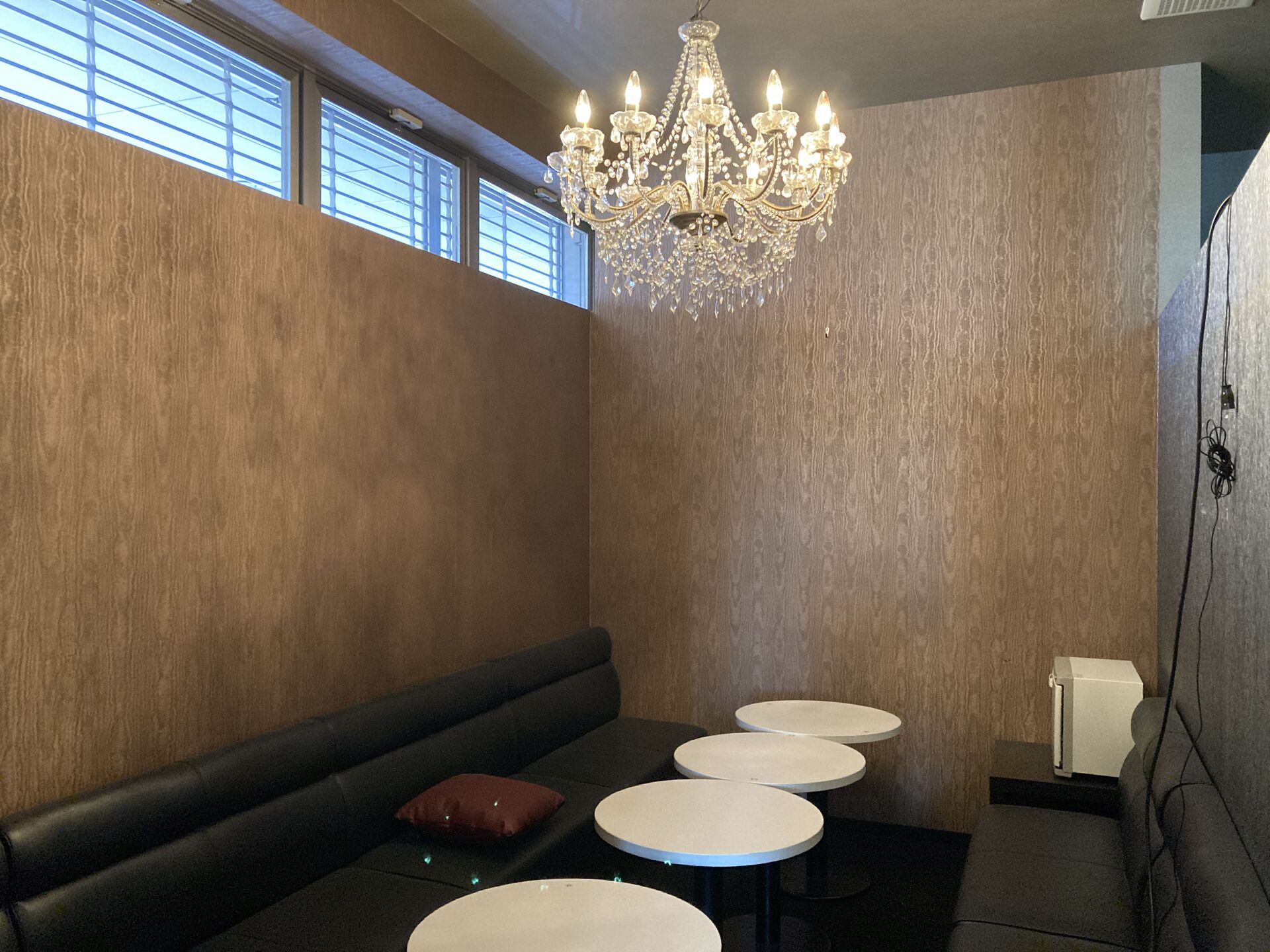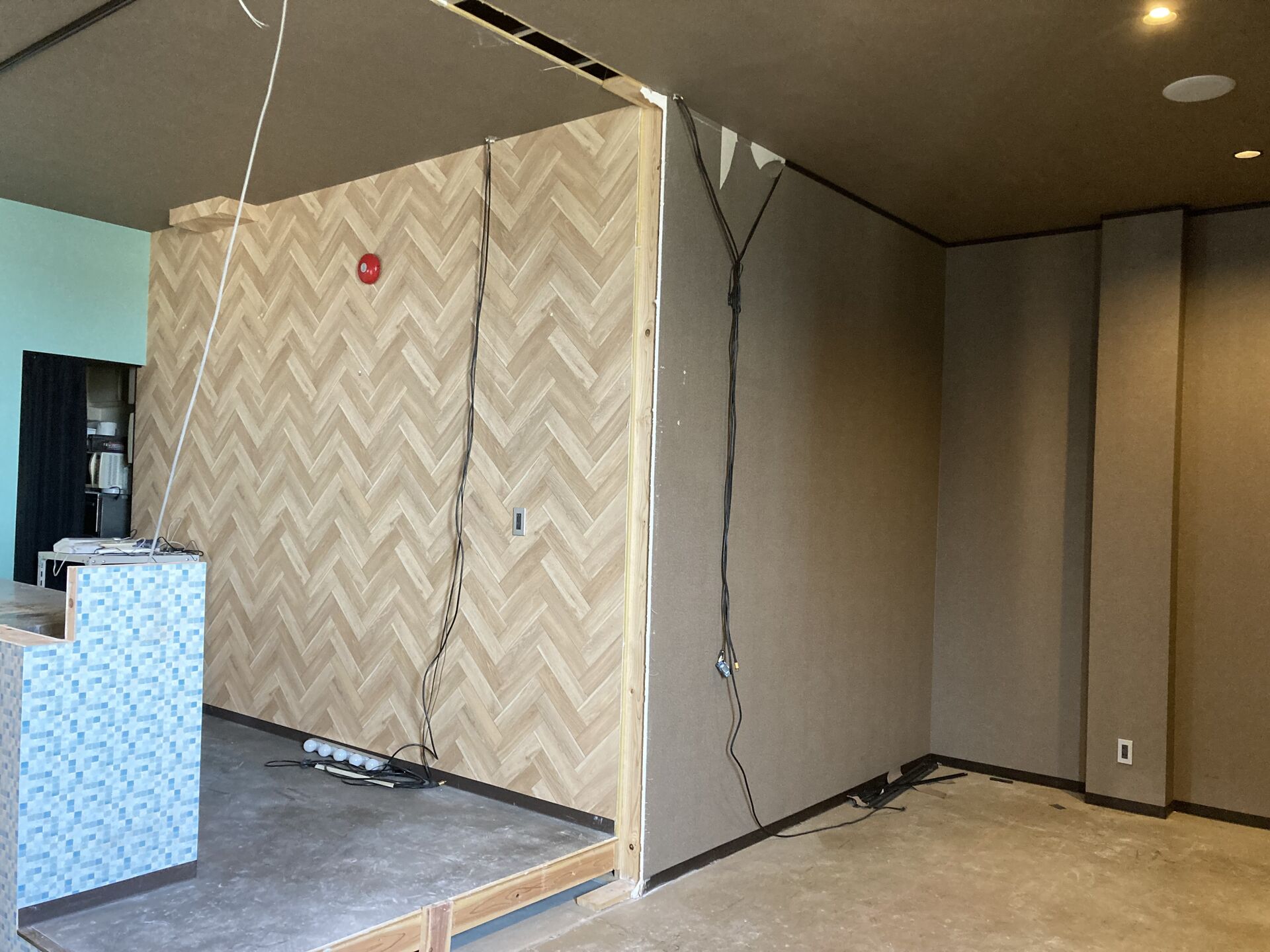 店舗入り口にお店のロゴをプリントした壁紙を施工、壁紙の貼り替え、床の張替工事、カウンターテーブルをLED照明に交換と盛り沢山あります。